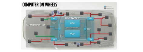 沃尔沃的区域电子电气架构包括Core System(核心系统)和Mechatronic Rim(机电区域),如下图所示。沃尔沃的VIU(Vehicle Integration Unit,整车集成单元)对应不同整车区域的感知、控制与执行。沃尔沃的VCU(Vehicle Computation Unit,整车计算单元/整车控制器)对应车载中央计算机,提供整车智能化所需的算力与数据存储。