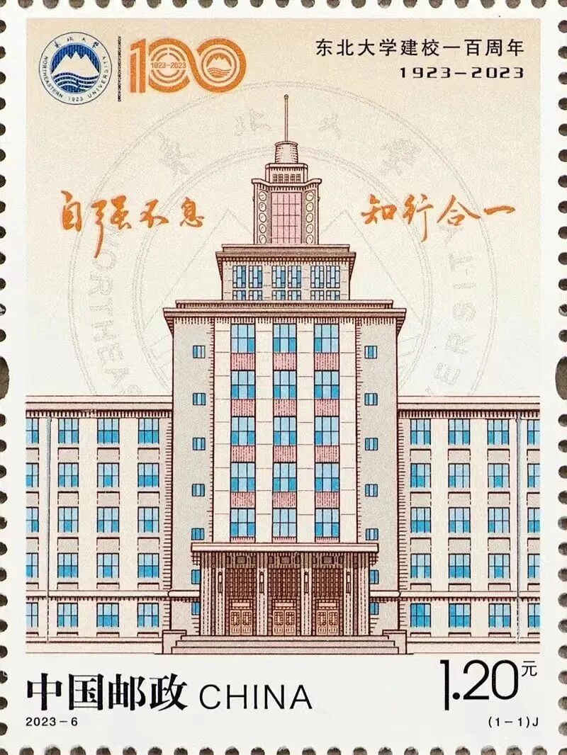 邮票画面采用雕刻线手法配合淡彩形式表现,展现了东北大学标志性建筑——南湖校区信息学馆。
