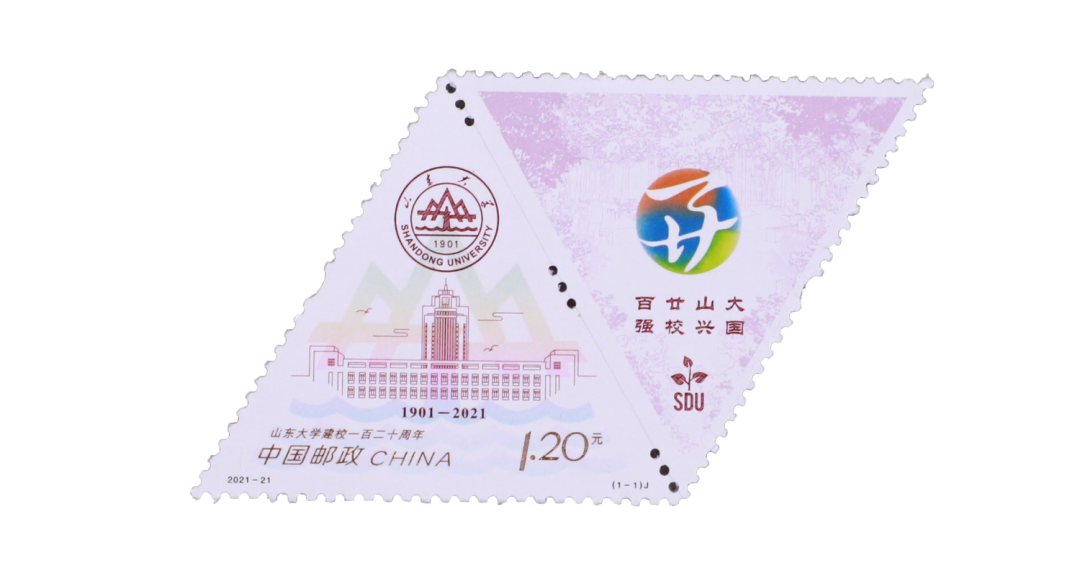 《山东大学建校一百二十周年纪念邮票》创新性地采用了平行四边形构图和左右分布的格局,形成了“一票双图”的视觉效果。