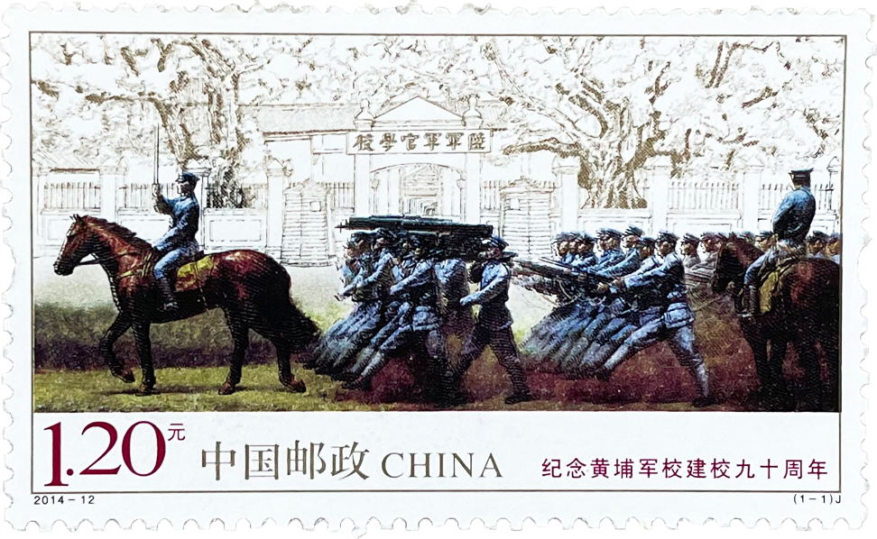 《纪念黄埔军校建校九十周年纪念邮票》背景为黄埔军校旧址大门,前景取油画作品《1924·黄埔军校》,表现了军校阅兵场景,彰显了黄埔军校的历史责任和革命精神。