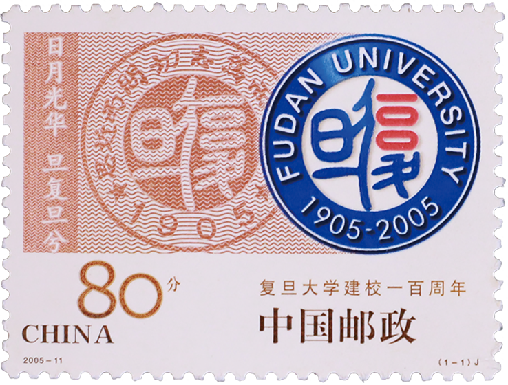 邮票以复旦大学学校徽和百年校庆校徽两个圆形徽记部分重叠为主图,背景的波纹设计象征大海,显示复旦大学地处上海、海纳百川的胸襟。