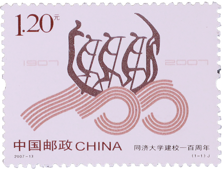 邮票以同济大学校徽中的“三人划龙舟”图案点缀由水纹组成的“100”校庆校徽图案。