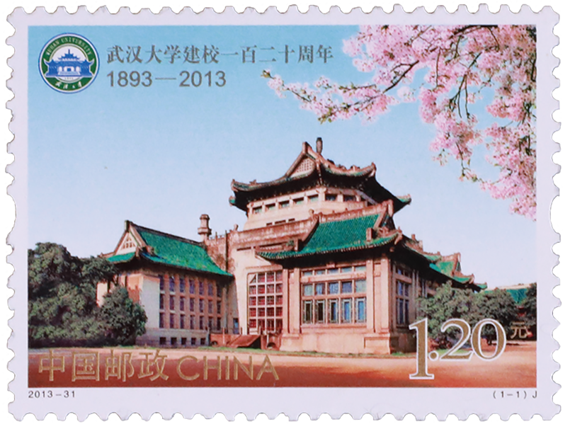 邮票以中西合璧宫殿式的武大老图书馆为主体,青色的琉璃瓦,腾飞的屋檐,将自然环境与人文底蕴高度融合。