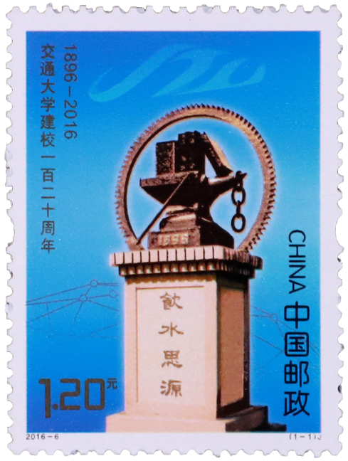 邮票以铸有交通大学校徽的“饮水思源”纪念碑为主图,背景的蓝色渐变彰显交大人海纳百川、放眼世界的胸怀和抱负。