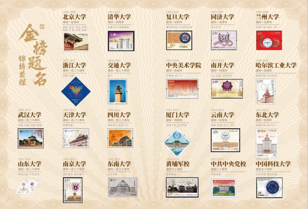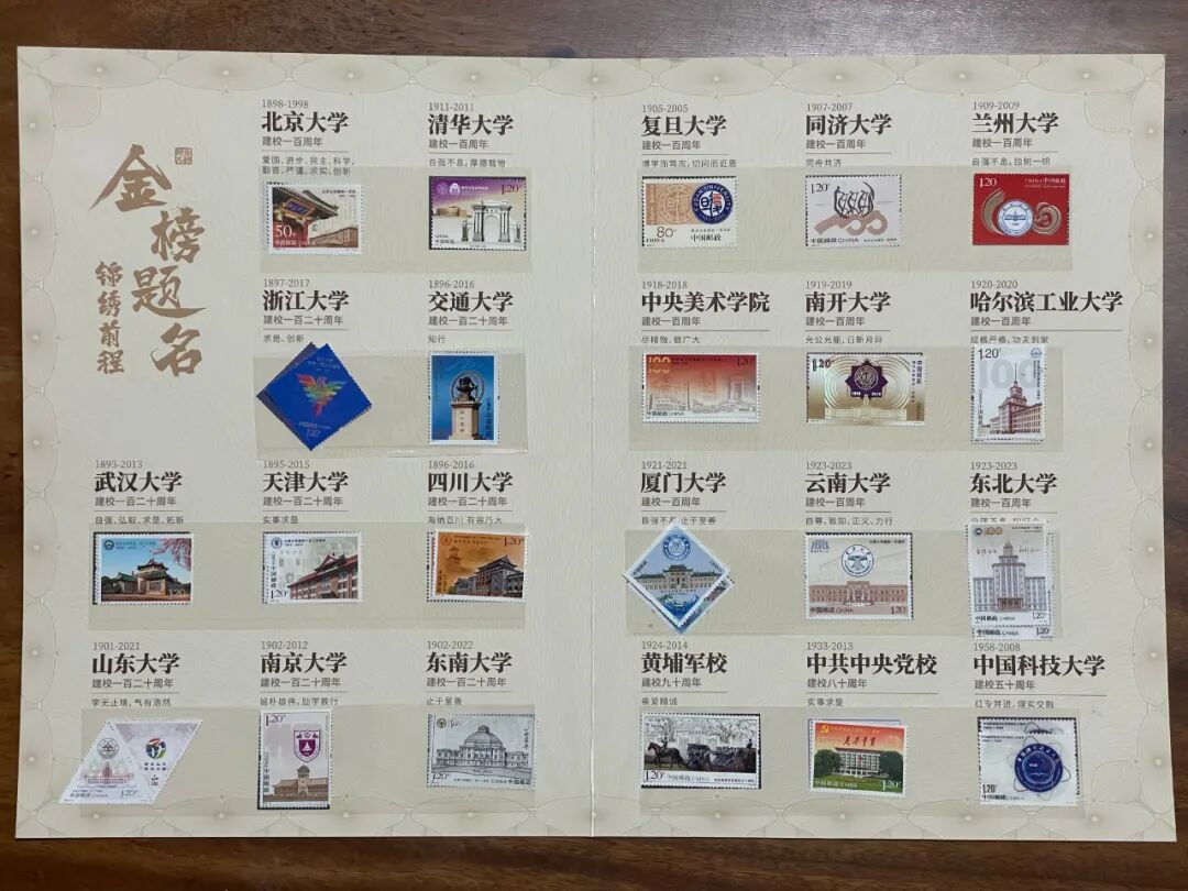迄今为止,中国邮政发行了22所著名高校邮票,包括清华大学、北京大学、复旦大学、南京大学、浙江大学、武汉大学等,全部被此珍藏册收录其中。