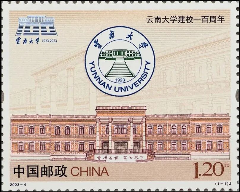 邮票画面以雕刻线条呈现云南大学代表性建筑“会泽院”的厚重历史,同时表现了云南大学校徽和百年校庆标识,画面色调古朴、层次丰富。