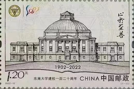 邮票画面以东南大学早期大礼堂的手绘建筑图为核心元素,下方以展开的书本、建校时间等为烘托,寓意“百廿名校、教书育人”。