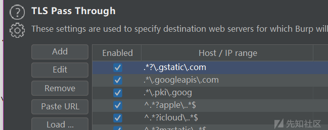 然后将这些将这些url添加到 Burp TLS Pass Through,但是TLS Pass Through可以选择粘贴 URL 或从文件加载列表。不支持刚才复制出来的格式。该文件每行应该有一个正常的 URL(不是正则表达式)。
