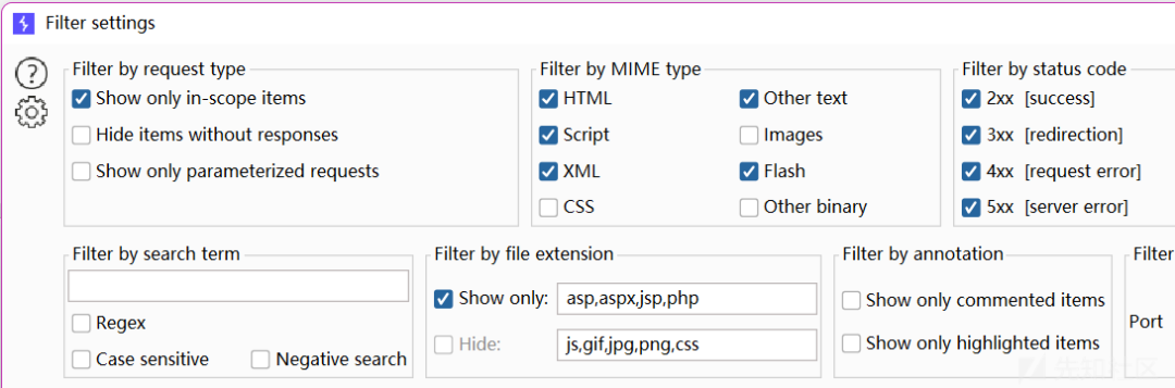 history也可以设置一些过滤选项大家都很熟悉,Filter by MIME type设置MIME类型,Other binary需要查看大多数二进制数据(application/octet-stream),Filter by file extension可以设置后缀的过滤,这里说一下Filter by file extension最好使用它的hide功能即可,过滤掉常见静态后缀和字体后缀即可。Filter by listener用的少一些,当应用程序在不同的端口上进行通信并且不支持代理设置时特别有用。