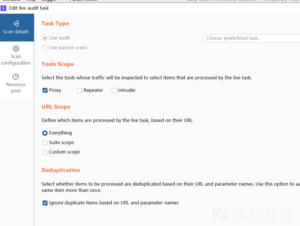 需要注意的就是不要一开始就使用主动扫描,很容易测试时候直接被waf给ban了,还没测就结束了,老版本有scanner的选项卡可以配置,新版可以在dashboard配置:
