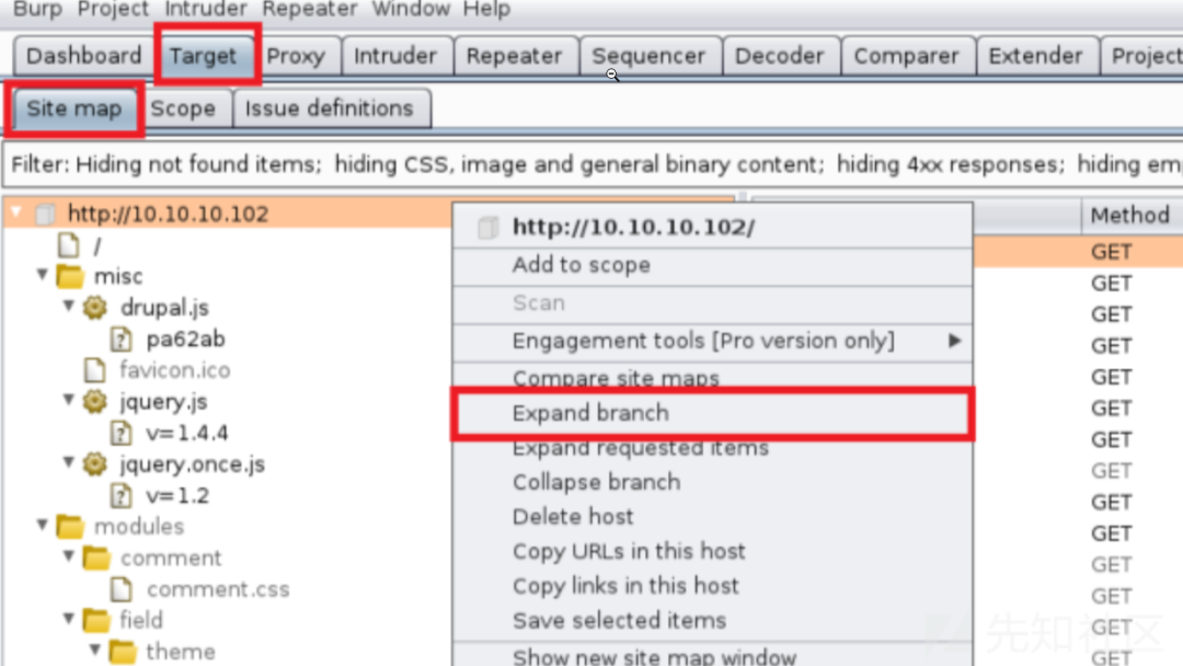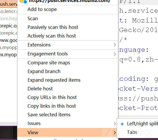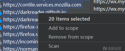 也可以对已经有的请求加入scope中,右键单击请求并选择Add to scope。然后您可以导航到Target > Scope并查看添加到范围的请求。