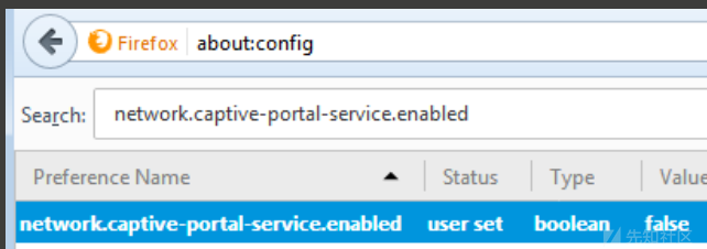 搜索 network.captive-portal-service.enabled 并单击它以切换为false,它将停止发送此请求