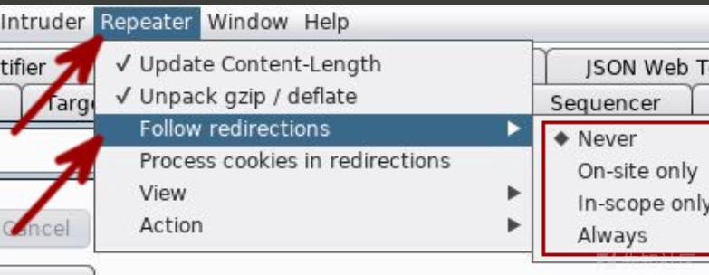 测试时候还可以设置Repeater 将自动跟踪重定向响应。