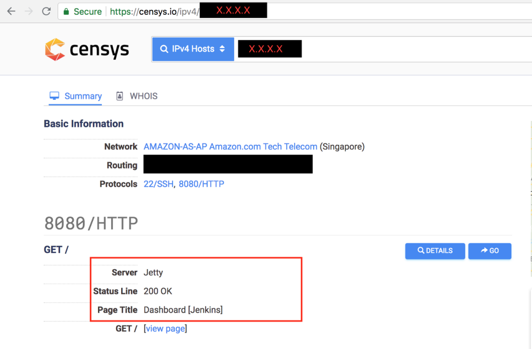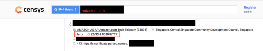 Censys具有查找IP地址并收集有关它们的信息的强大能力。Censys还通过分析SSL证书,打开的端口等来帮助发现内部工具和资产。br当我在同一目标网站上搜索目标域名时(由于它是一个私有程序,所以将其称为re dacted.com,因此无法透露名称),我发现一个实例在8080端口上运行— Censys结果