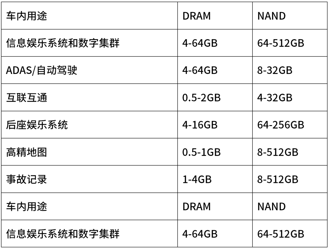 具体而言,智能座舱、车联网、智能驾驶等功能的实现均需要一定的存储空间来支持其正常运行。以智能驾驶为例,根据镁光科技及中国闪存市场预计,L2、L3级的自动驾驶汽车对内存带宽要求大致为100GB/s,对NAND Flash的平均容量需求约为32GB,而未来L4、L5级的全自动驾驶汽车则需要300GB/s-1TB/s的内存带宽,对NAND Flash的平均容量需求约为256GB。