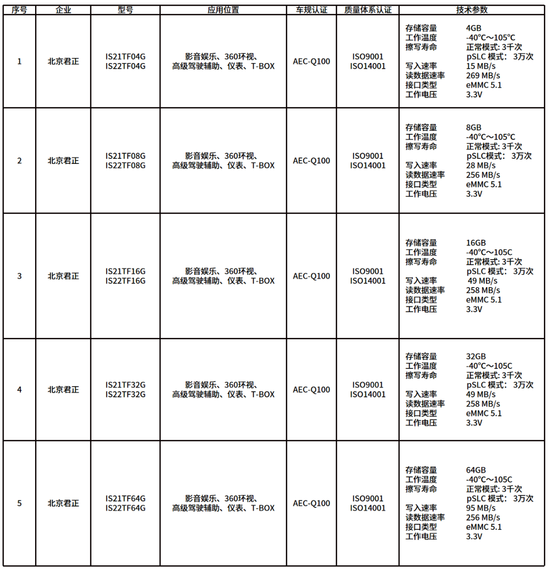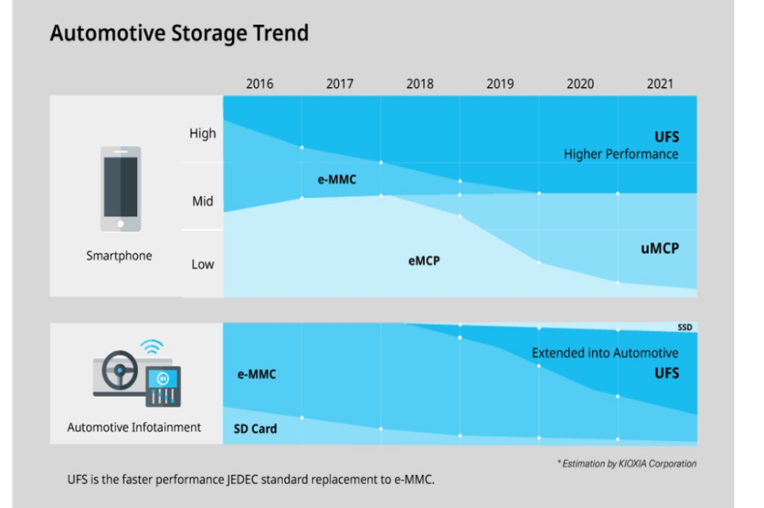从车载存储技术来看,以往车载NAND Flash存储器多为eMMC,数据存储用量提升后,性能更好的UFS存储有望逐渐渗透。