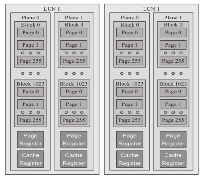 闪存芯片内部分为LUN(逻辑单元), PLANE(平面), BLOCK(区块), PAGE(页);一个封装好的闪存芯片可能包含若干个LUN(逻辑单元);一个PLANE(平面)就是一个存储矩阵,包含若干个BLOCK(区块);BLOCK(区块)是闪存的最小擦除单位,一个BLOCK(区块)包含了若干个PAGE(页);PAGE(页)是闪存的最小读写单位,一个PAGE(页)包含若干个BYTE(字节)。闪存阵列结构