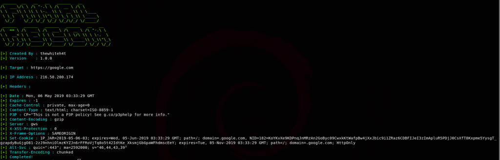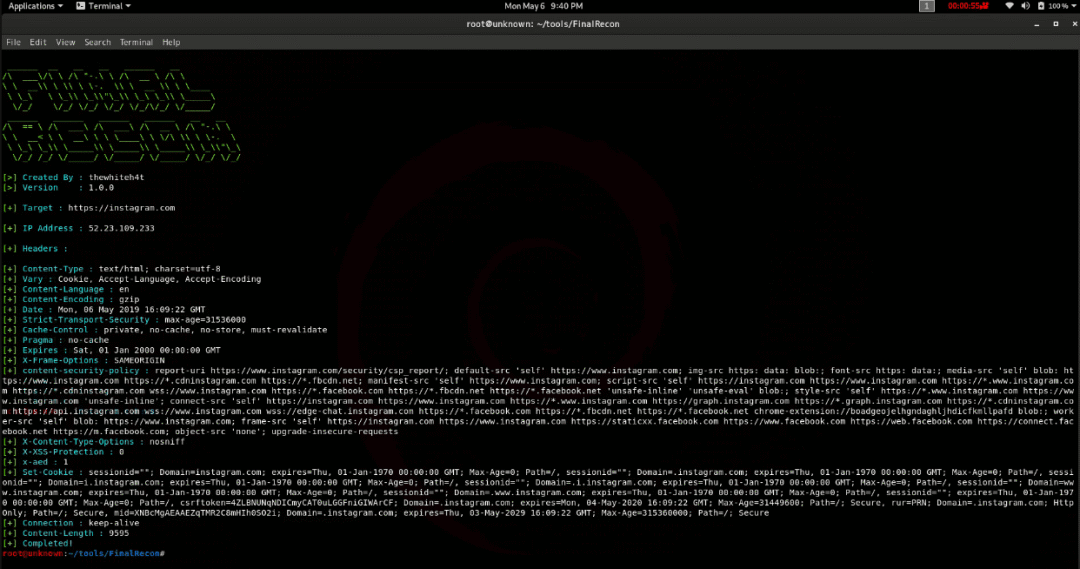 # Check headerspython3 finalrecon.py --headers <url># Check ssl Certificatepython3 finalrecon.py --sslinfo <url># Check whois Informationpython3 finalrecon.py --whois <url># Crawl Targetpython3 finalrecon.py --crawl <url># full scanpython3 finalrecon.py --full <url>