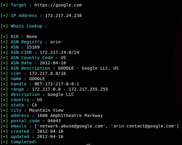 python3 finalrecon.py -husage: finalrecon.py [-h] [--headers] [--sslinfo] [--whois] [--crawl] [--full]urlFinalRecon - OSINT Tool for All-In-One Web Recon | v1.0.0positional arguments:url Target URLoptional arguments:-h, --help show this help message and exit--headers Get Header Information--sslinfo Get SSL Certificate Information--whois Get Whois Lookup--crawl Crawl Target Website--full Get Full Analysis, Test All Available Options