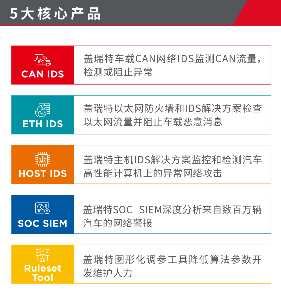 盖瑞特车端IDS是独立于硬件设备的IDS产品解决方案,能够高度准确地检测车辆系统中的异常情况,并向安全运营中心(SOC)汇报,可覆盖超过90%以上的黑客攻击场景,适用于多种不同的车载系统。
