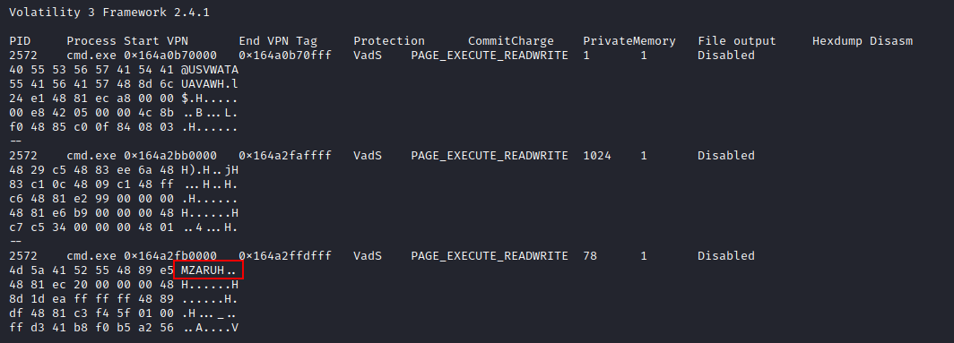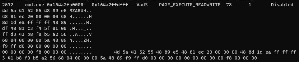 查看内存转储,在注入的 cmd.exe 进程中很容易观察到为 Cobalt Strike 信标注入的 MZ 标头。(splunk博客分析讨论Cobalt Strike beacon注入时的MZ标头特征)
