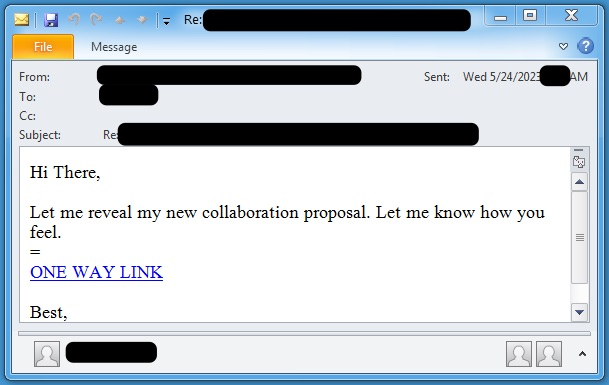 如其他入侵案例一样,这次的案例依然是从钓鱼邮件开始的。Proofpoint的研究人员在下图(https://twitter.com/threatinsight/status/1666441387447926797)中展示了攻击者如何利用404流量分发系统让邮件收件人在点击链接之后跳转到文件下载页面的(https://twitter.com/threatinsight/status/1666403634312105987)。