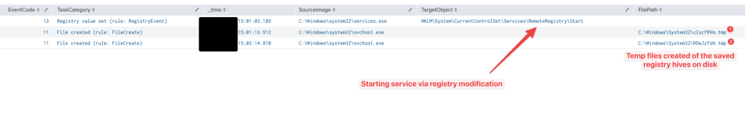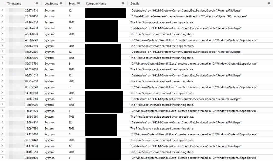 为了滥用此SCM行为,我们看到攻击者在删除该服务的 HKEY_LOCAL_MACHINE\SYSTEM\ControlSet001\Services\Spooler\RequiredPrivileges 注册表项之前停止了 Spooler 服务,重新启动该服务,并注入到新创建的 spoolsv.exe 进程