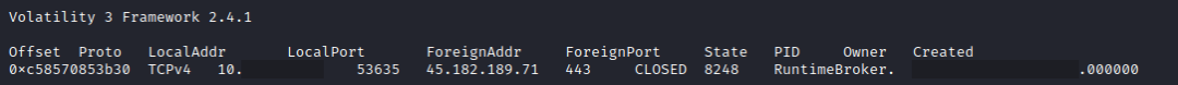 查看从滩头主机收集的内存,我们可以观察到 Runtimebroker.exe 与 Truebot 命令和控制服务器的连接,Runtimebroker.exe 是从初始恶意软件负载复制后重命名的可执行文件。