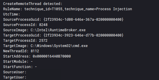 我们在这次入侵中观察到所有三个恶意软件家族的进程注入。首先,Truebot 使用它将 Cobalt Strike 有效负载注入 cmd.exe 进程。