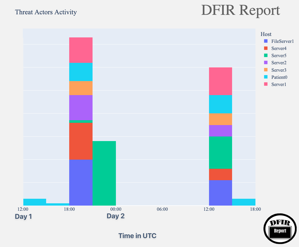 我们创建了一个图表,显示攻击者在网络中活跃的时间 (UTC)。该数据基于受影响主机的样本,但活动模式在整个入侵过程中保持一致。