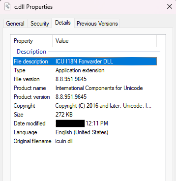 注入模块c.dll的PE细节是一个原名为icuin.dll的DLL,自称是Unicode库的International Components的一部分,如下所示: