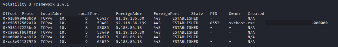 从跳板机和其他几台失陷主机的内存中,我们发现一台服务器内存中保留了FlawedGrace 所在进程svchost.exe到C2服务器的网络连接状态