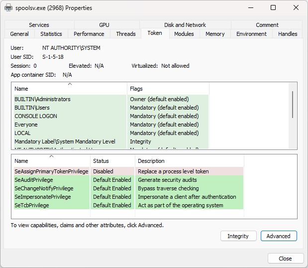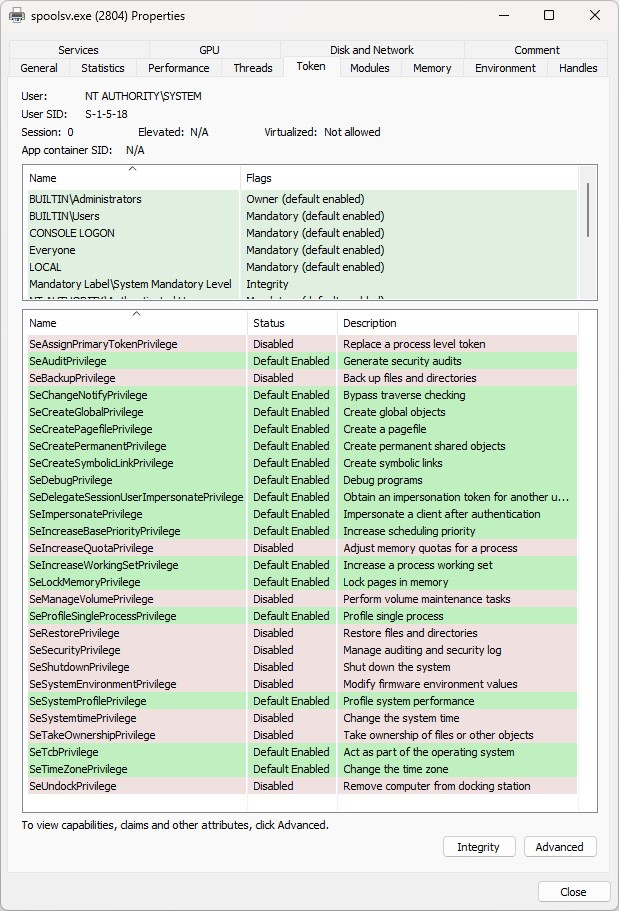 可以在以下屏幕截图中观察到删除 RequiredPrivileges 注册表项的效果,其中可以看到修改后的 spoolsv.exe 进程具有一系列额外的权限,所有这些权限攻击者都可以在注入后使用。