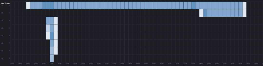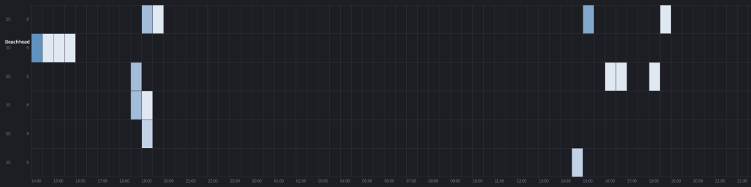 虽然 Cobalt Strike 命令和控制在入侵期间保持活跃,但攻击者确实有选择地在主机上部署和删除它,只有滩头主机在整个期间保持信标活动。