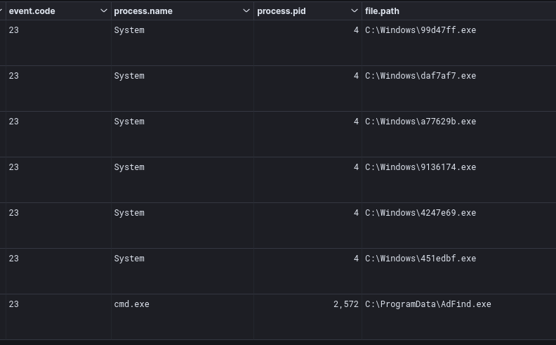 # AdFindName: AdFind.exeSize: 1619968 bytesMD5: 12011c44955fd6631113f68a99447515SHA1: 4f4f8cf0f9b47d0ad95d159201fe7e72fbc8448dSHA256: c92c158d7c37fea795114fa6491fe5f145ad2f8c08776b18ae79db811e8e36a3