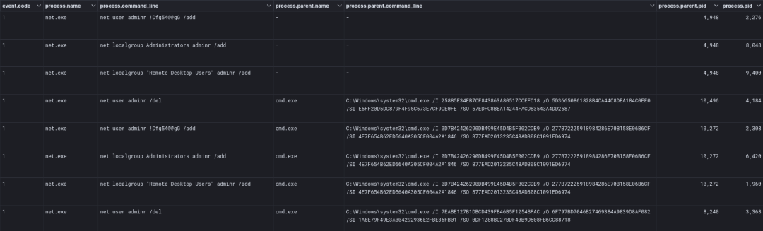 在滩头主机上(beachhead是指攻击者在网络中建立持久性或控制一个主机的初始入口点),攻击者添加了一个名为 adminr 的用户帐户。然后将此帐户添加到本地管理员组和远程桌面用户组。随后,观察到该帐户被用于测试环境中的 RDP 隧道。该帐户被多次添加和删除,但在初始访问的三个小时后,它被删除并且没有被威胁者重新添加。