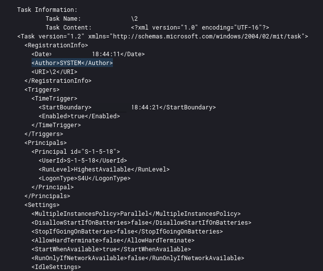 由于恶意软件大部分都由计划任务启动,因此攻击者直接获得了SYSTEM权限。例如FlawedGrace最初创建的计划任务: