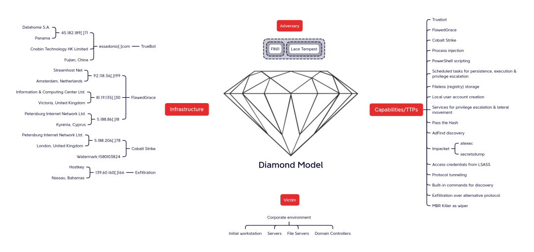 据Mandiant报告,在2023年1月FIN11攻击团伙在利用SolarWinds Serv-U server 漏洞CVE-2012-35211后,部署了TRUECORE(Truebot的一个分支版本)和BARBWIRE(即FlawedGrace)。BARBWIRE启动后回连C2服务器:5.188.86[.]18:443,这个C2服务器也出现在本次入侵案例中。同年4月,Mandiant又发现了一个BARBWIRE的C2服务器:92.118.36[.]199:443,在本次入侵案例中同样出现。Mandiant还注意到shellcode载荷被存储在一个TRUECORE的C2服务器上,指向5.188.206[.]78,这也是本次案例中的Cobalt Strike服务器。Mandiant还确认,他们早在2019年就发现FIN11使用MBR Killer。根据Mandiant的说法,FIN11自2018年以来一直在使用BARBWIRE,并且他们认为这个后门程序是该威胁组织专用的。