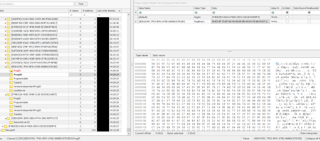 解码代码将变量 $j 设置为值 {8D81676C-7F63-8F81-676E-666B6C67818D}。然后它从 SOFTWARE\2\CLSID\{8D81676C-7F63-8F81-676E-666B6C67818D}\Type键下的Windows注册表中读取一个值,将该值转换为 UTF-8 字符串并执行它。