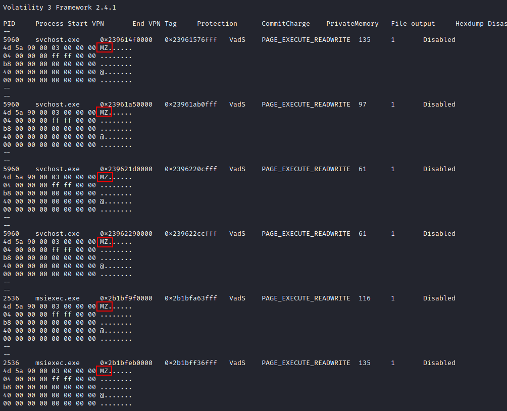 Cobalt Strike 并不是唯一具有可观察标头的注入,每个 svchost.exe 和 msiexec.exe 还包含明显的注入标志,如 PAGE_EXECUTE_READWRITE 保护和 MZ 文件标头。