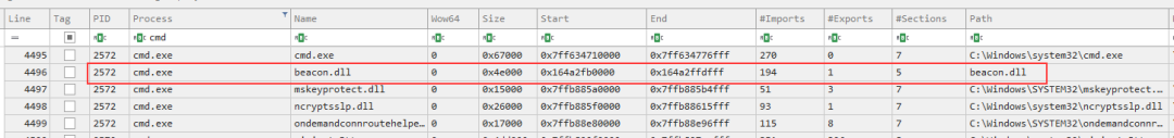 进一步取证后发现在加载模块偏移量0x164a2fb0000处存在beacon.dll,这是Cobalt Strike生成载荷的默认名称,DLL文件没有完整的本地磁盘路径显得更加违和。Cobalt Strike用于信息收集和横向移动,详情见后续章节。