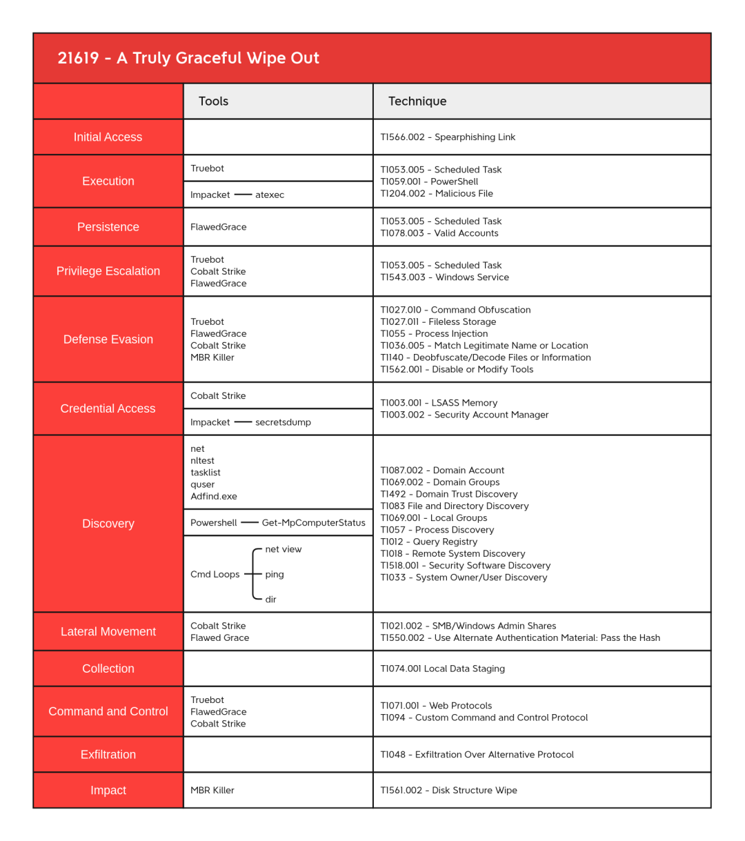 Process Injection - T1055 Disk Structure Wipe - T1561.002 Exfiltration Over Alternative Protocol - T1048 Match Legitimate Name or Location - T1036.005 Disable or Modify Tools - T1562.001 Deobfuscate/Decode Files or Information - T1140 Fileless Storage - T1027.011 Command Obfuscation - T1027.010 Scheduled Task - T1053.005 PowerShell - T1059.001 Malicious File - T1204.002 Web Protocols - T1071.001 Custom Command and Control Protocol - T1094 System Owner/User Discovery - T1033 Domain Groups - T1069.002 Local Groups - T1069.001 Domain Trust Discovery - T1482 Process Discovery - T1057 Domain Account - T1087.002 File and Directory Discovery - T1083 Remote System Discovery - T1018 Security Software Discovery - T1518.001 Query Registry - T1012 SMB/Windows Admin Shares - T1021.002 Local Data Staging - T1074.001 LSASS Memory - T1003.001 Pass the Hash - T1550.002 Valid Accounts - T1078 Create or Modify System Process: Windows Service - T1543.003OS Credential Dumping: Security Account Manager - T1003.002Spearphishing Link - T1566.002