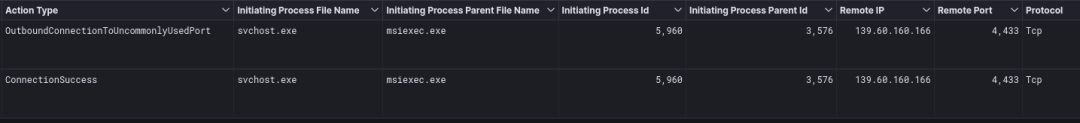 在入侵的第二天,从文件服务器开始通过端口 4433 连接到 IP 139.60.160[.]166。进程树表明 FlawedGrace 恶意软件注入了文件服务器上的 svchost 和 msiexec 并启动了传输。其他报告表明 Truebot/FlawedGrace 入侵适用自定义工具进行数据提取。我们没有观察到任何额外的二进制文件被丢弃到磁盘来执行提取。由于 FlawedGrace 进程建立了 TCP 连接,我们以适度的信心评估该功能包含在 FlawedGrace 恶意软件本身中。
